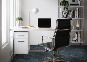 ตัวอย่าง ปูพรมห้องทำงาน ปูด้วยพรมแผ่น รุ่น Over the Ocean รหัส Storeline OC 04 – Black Pearl OC 06 และ Seagrass OC 10